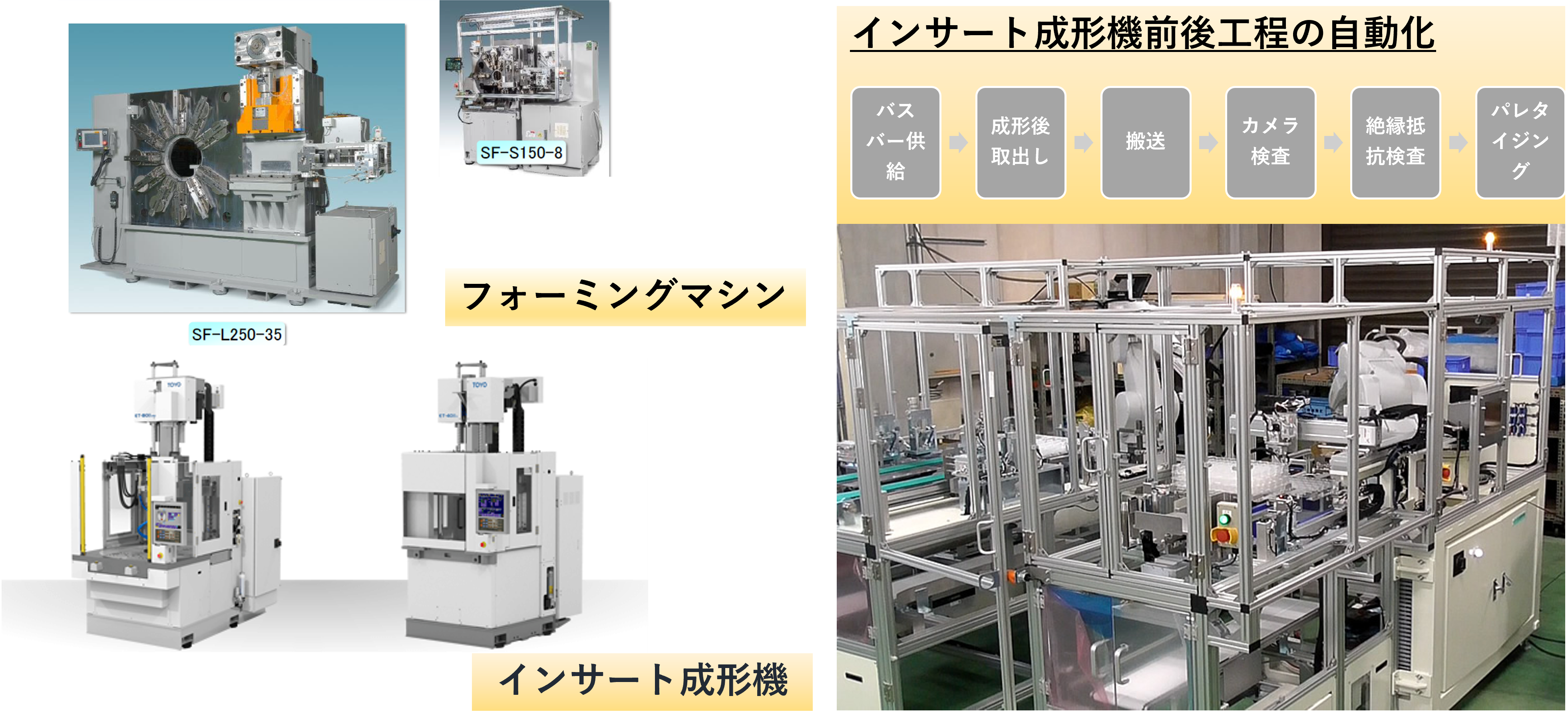 調合・混練の最上流工程から、バッテリーパックの組立及びEOL検査までの最下流工程まで、バッテリーの製造に関わる全ての工程において、貴社のご要望に沿ったソリューションをご提案いたします。製造設備のみならず研究開発用設備についてもご提案いたします。例)バッテリーバスバーモジュール(BBM)部品の製造設備BBM構成部品となるバスバーの製造設備に加えて、各バスバーを樹脂により一体化させるインサート成形機とその周辺装置をご提案いたします。